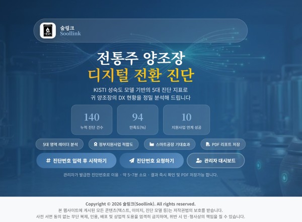 soollink에서 전통주 제조장의 성공적인 디지털 전환(DX)을 지원하기 위해 '온라인 제조장 진단 서비스' 를 개발 마무리 단계에 있습니다.