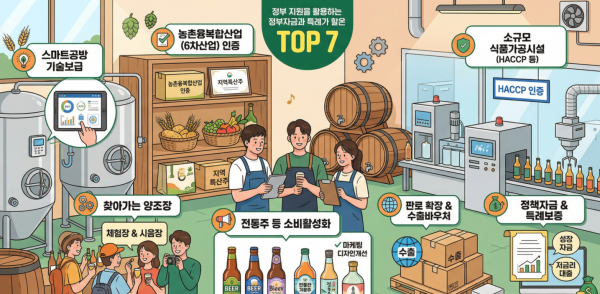 소규모 양조장의 도약과 자생력을 돕는 7대 핵심 정부 지원사업은 크게 인프라 고도화(스마트공방, 가공시설 지원), 브랜드 및 판로 확장(찾아가는 양조장, 소비활성화, 수출바우처), 그리고 종합 인증 및 자금       (6차산업, 정책자금)으로 나뉩니다. 양조장의 현재 성장 단계와 지역특산주(농업법인) 면허 여부에 맞춰 가장 확률이 높은 사업부터 전략적으로 타겟팅하는 것이 중요합니다.
