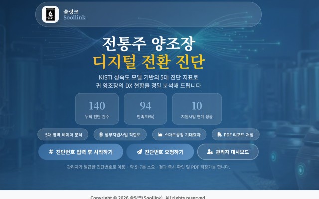 공지사항/자료실 Total 1건 1 페이지 RSS 게시판 검색 0 공지 온라인 제조장 진단 서비스 개발 soollink에서 전통주 제조장의 성공적인 디지털 전환(DX)을 지원하기 위해 '온라인 제조장 진단 .. 작성자 최고관리자 작성일 04-20 검색 검색대상 제목내용제목+내용글쓴이글쓴이(코) 검색어 필수 검색 닫기